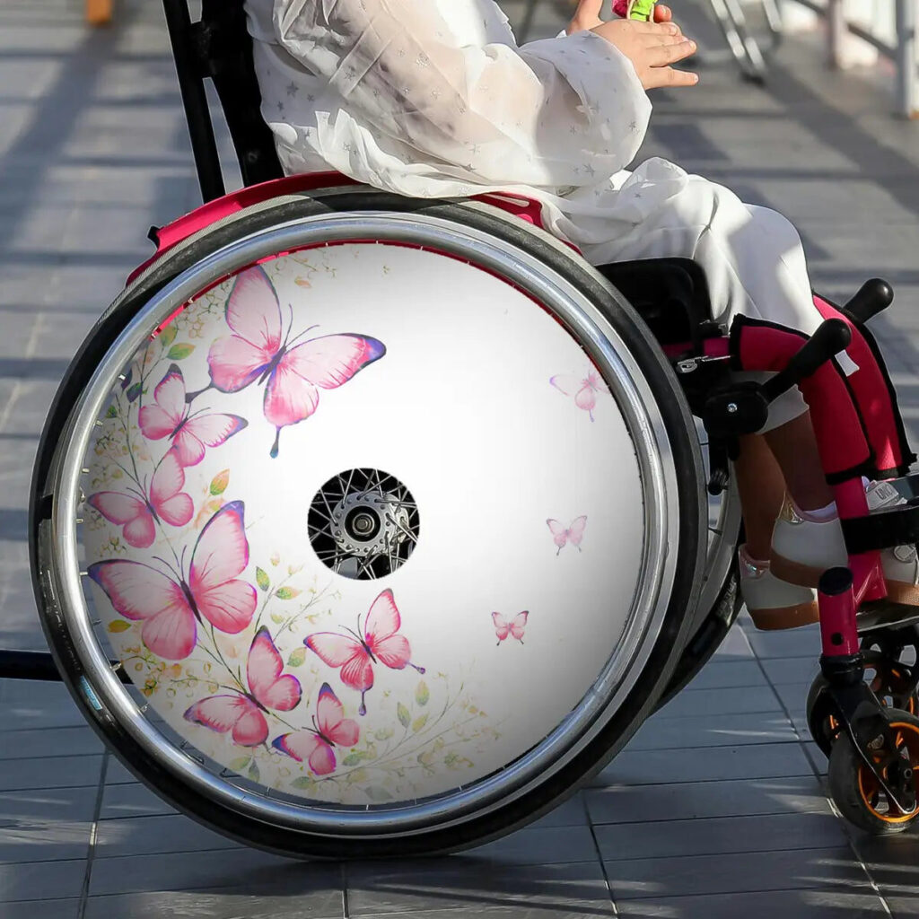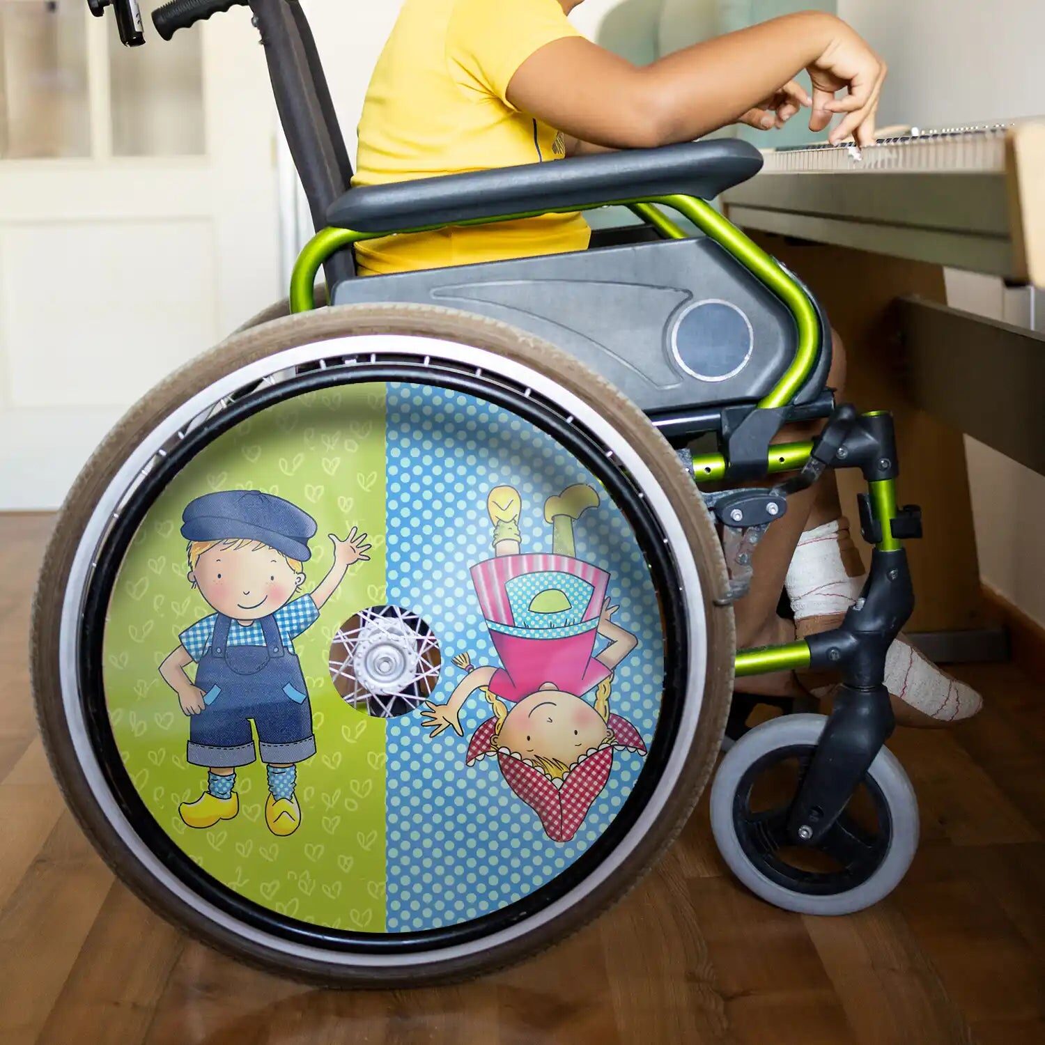 Das Bedruckte Speichenschutz-Set bietet eine einzigartige, maßgeschneiderte Optik für Mobby-SP-Stühle mit Rollstuhlrädern. Dieses Set enthält Polycarbonatscheiben, die mit individuellen Designs bedruckt werden können, einschließlich Firmenlogos oder anderer visueller Elemente, vollständig abgestimmt auf die Wünsche des Kunden.