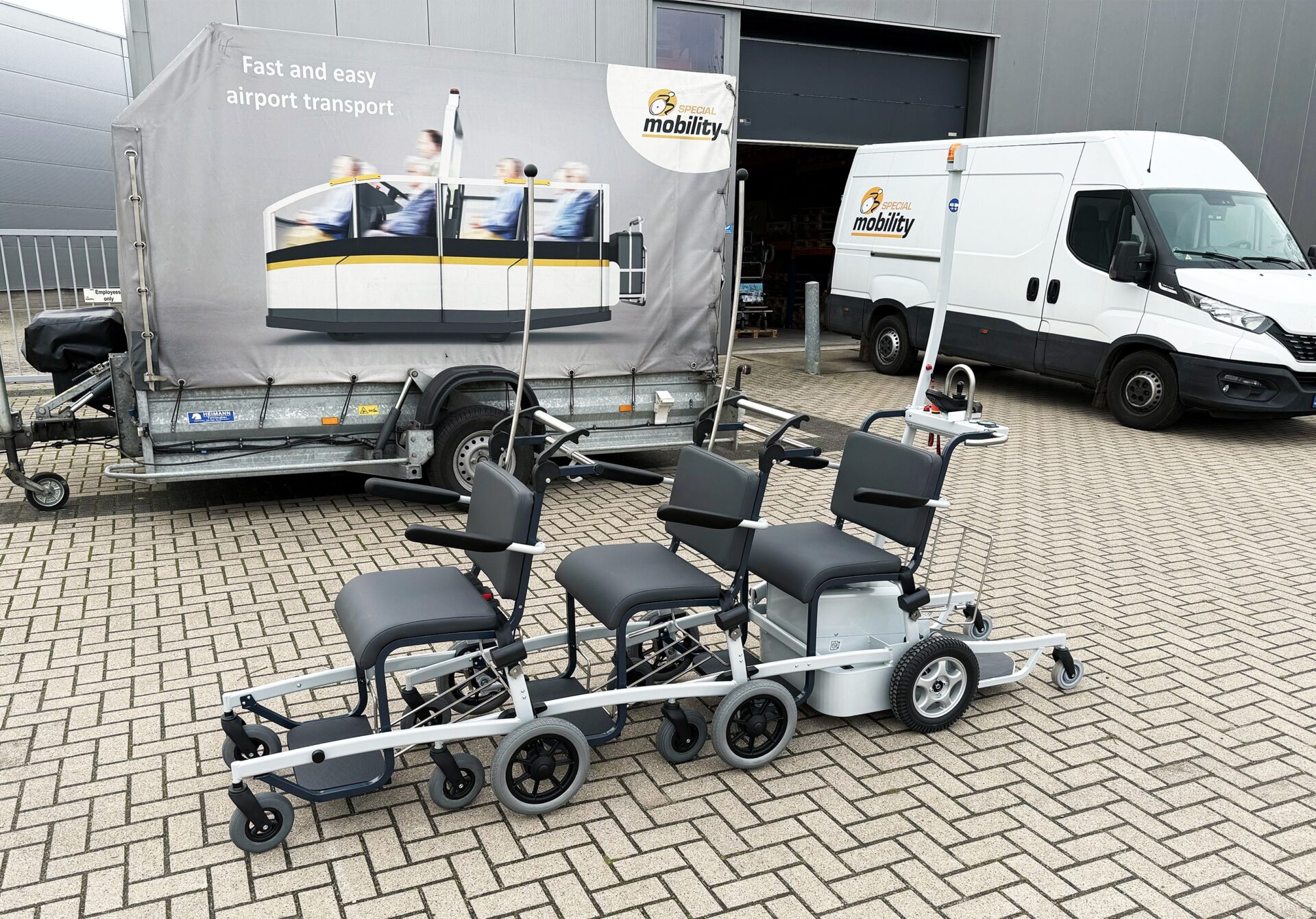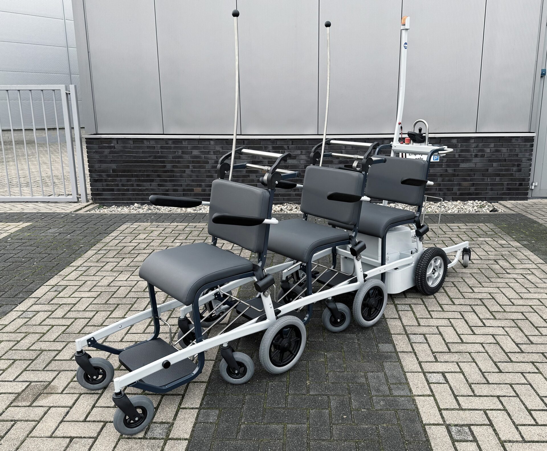 A Multi-Seated Configuration is instantly identifiable as the Mobby product line’s biggest USP: the way you can link and unlink chair together in a train to transport multiple chairs at once. It’s the most recognisable way people see Mobby products operating at airports and in hospitals around the world. The Multi-Seated Configurations also offer: